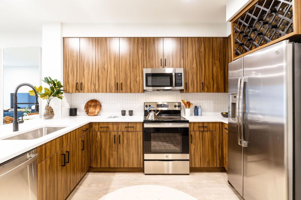 Design distinction extends into the generously appointed homes, which feature 9’ ceilings, champagne oak flooring, oversized windows with water and city views, custom modular closets, and in-unit washer & dryers. Modern kitchens are adorned with white quartz counters, walnut cabinets, wine storage, and stainless-steel appliances. Select residences offer private, furnished outdoor space.