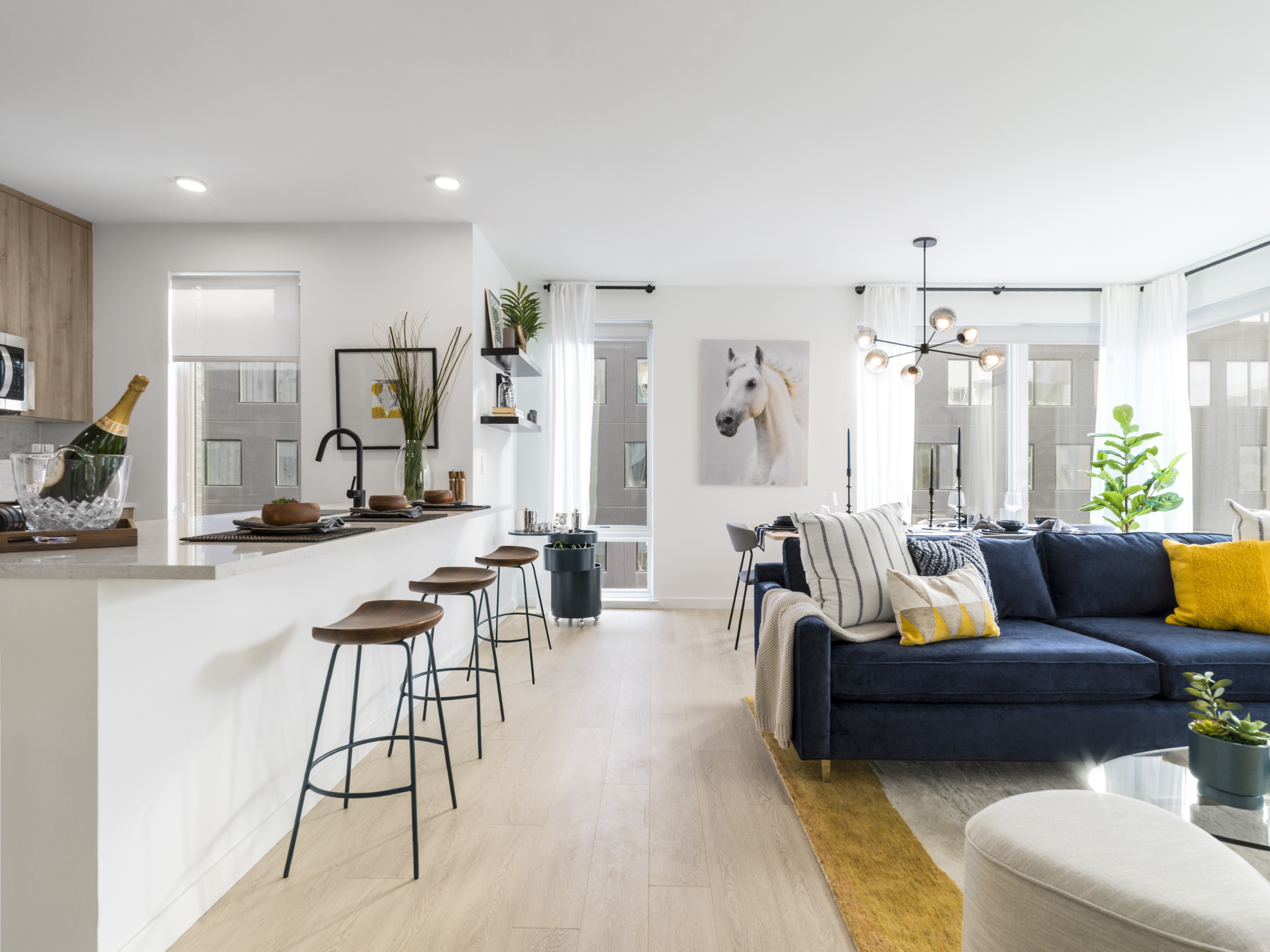 Three professionally merchandized homes are available to tour: a studio residence with interior design by Rosalie Nunez, a one-bedroom residence with interior design by Cochineal Design, and a two-bedroom residence with interior design by BG Studio.