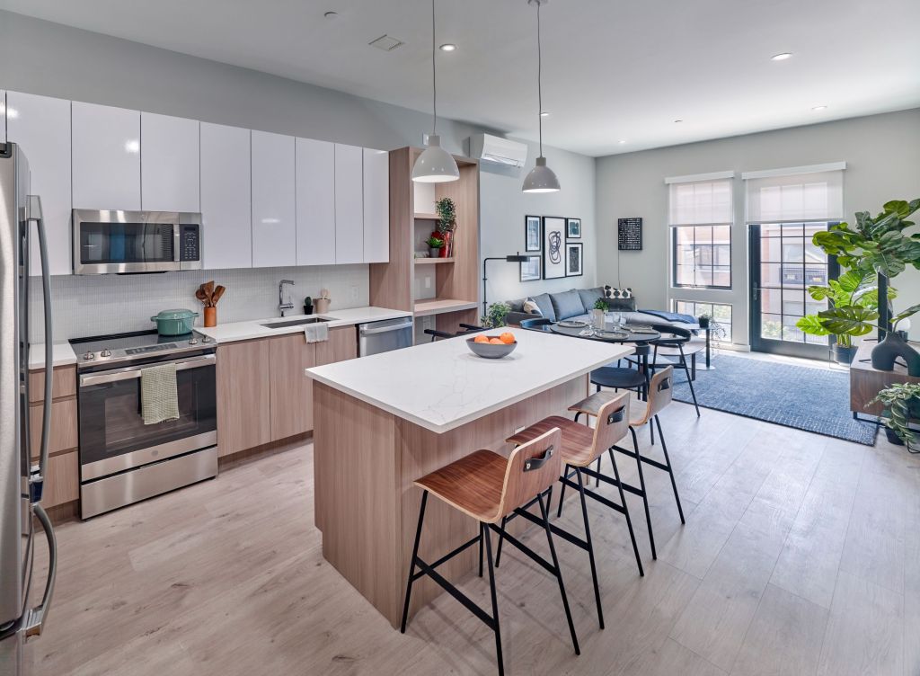 Designed by MHS Architecture, most homes at The Wyldes offer 10’ ceilings and select loft residences offer 13’ ceiling heights. Residences boast oversized Pella windows maximizing natural light, luxury plank flooring, Bosch in-home washer/dryers, integrated millwork home office nooks with floating shelving in most homes, along with kitchens offering GE stainless steel appliances, designer cabinetry and quartz countertops. Most apartments provide balconies or expansive terraces.